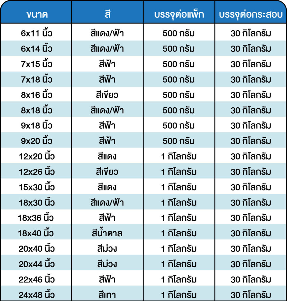 ขนาด 4×18 นิ้ว – 9×18 นิ้ว เป็นหูเกี่ยว บรรจุแพ็ก 500 กรัม